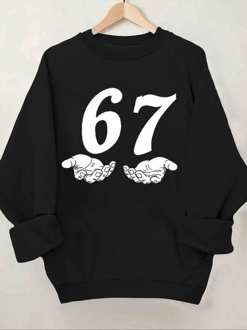 "67" Hands Graphic Sweatshirt, Edgy Streetwear Aesthetic Crewneck, Black Casual Pullover, Women's Trendy Urban Fashion Top with Whimsical Number Print
